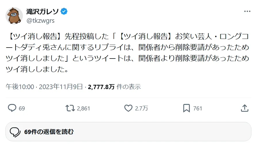 ロングコートダディ兎さんの炎上がここまで大きくなったきっかけは、暴露系インフルエンサーの滝沢ガレソさんによる投稿が発端となりました。
